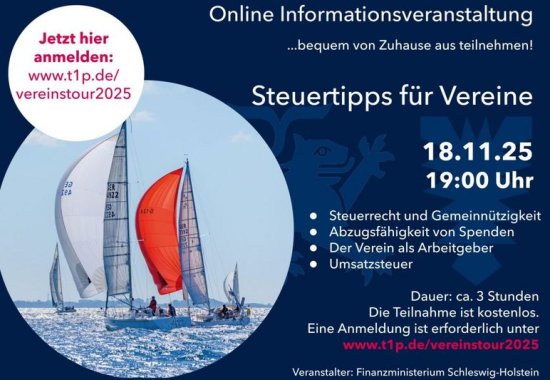 Das Finanzministerium Schleswig-Holstein lädt alle Interessierten zu einem kostenlosen Online-Seminar für Vereine und Verbände ein. Praxisnahe Informationen und wertvolle Tipps zur Inanspruchnahme von steuerrechtlichen Vorteilen für Vereine stehen im Fokus der Veranstaltung, die Finanzministerin Silke Schneider persönlich begleiten wird. Finanzministerin Silke Schneider: „Vereine leisten durch ihre sportlichen, kulturellen und sozialen Angebote einen unverzichtbaren Beitrag zum gesellschaftlichen Leben. Dieses wichtige Engagement verdient Respekt und Unterstützung.“